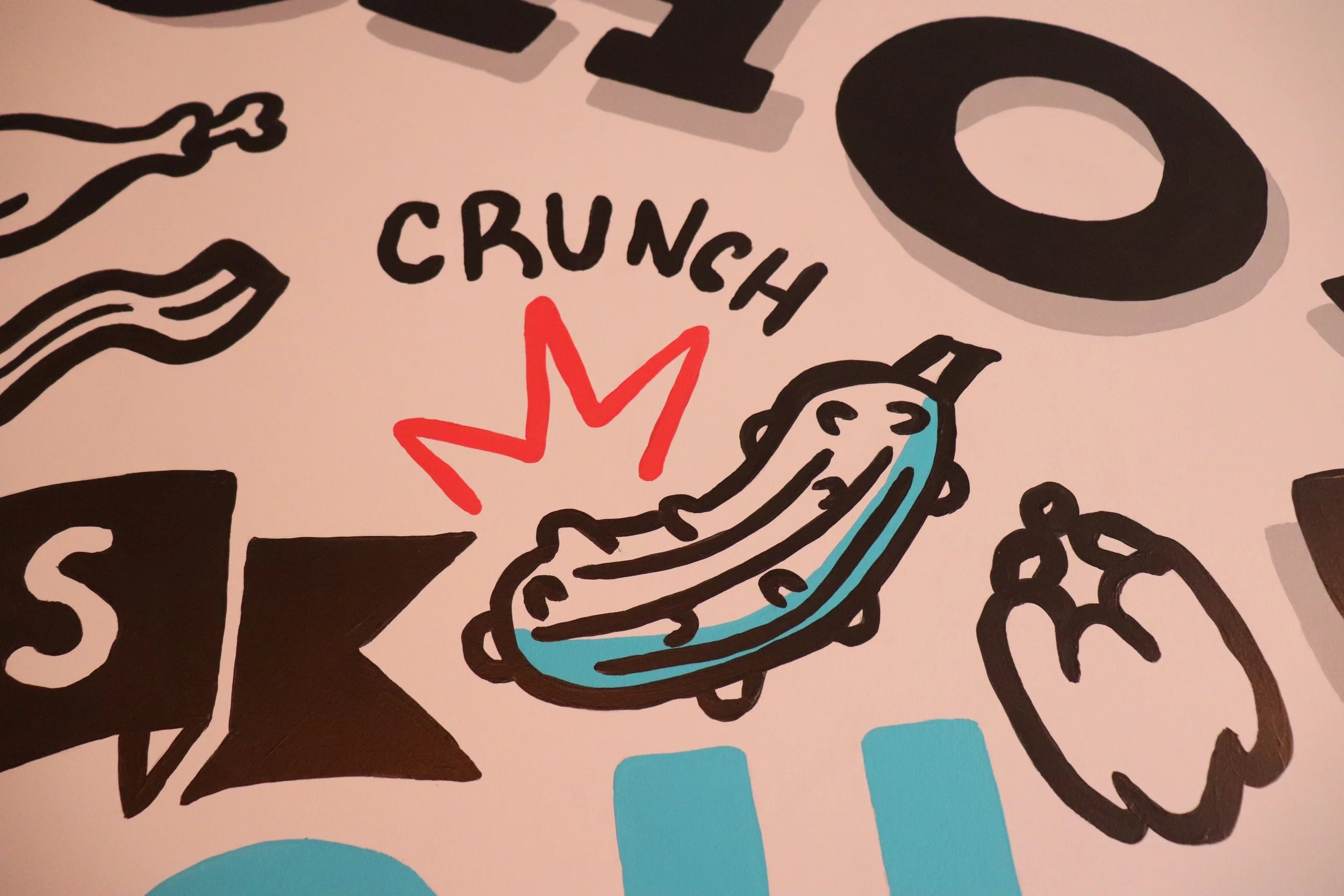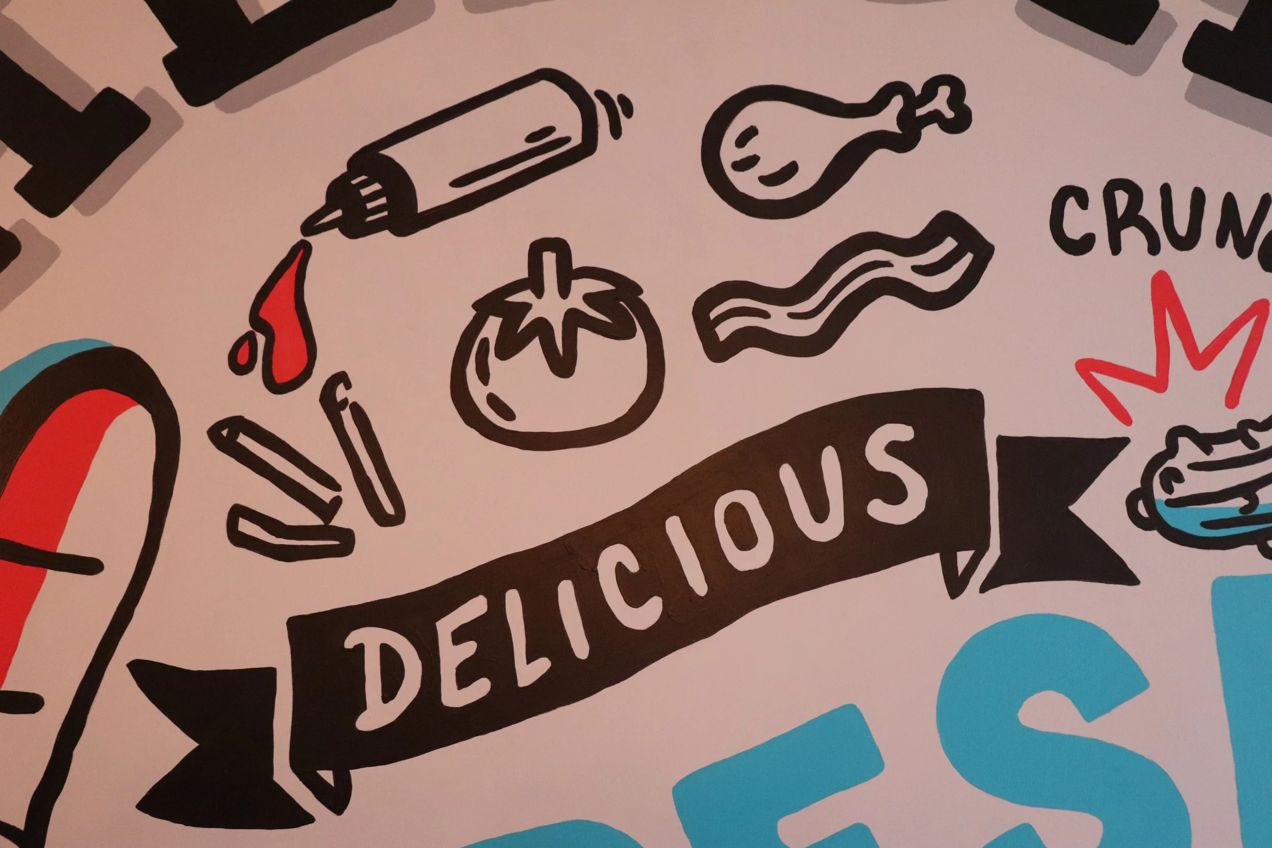 This wall mural is tailored toward Cheecho’s—an Ottawa street restaurant—by using ingredients from their menu as well as the owner’s love for Rock’n’Roll and their dog Harley. Their branding is black and grey, but they wanted little pops of red and blue to tie it all together. The wall before was so bland, and now this artwork is the first thing you see when you walk in - adding a bit of light and joy into the space, which captures the kindness the owners radiate.